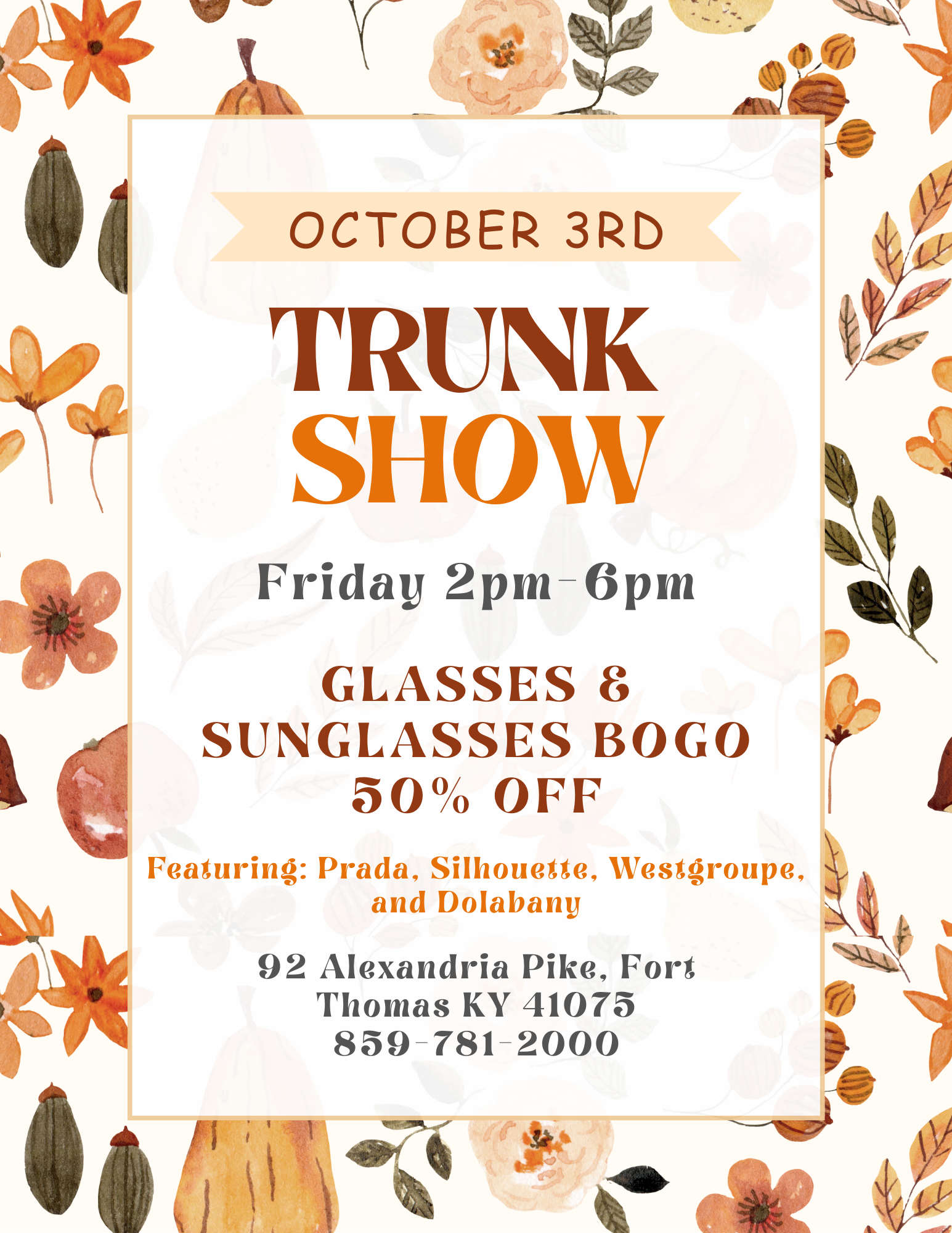 A trunk show is a huge glasses sale that is typically hosted at our office. Our staff invites 3-4 of our favorite frame vendors to come in for a day and bring their entire collection of frames for patients to be able to shop and see every model in every color variation. Discounts are always the best on trunk show days but sale details can vary from show to show.